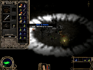 Your light objects consists of potions, scrolls, magic items and the like. The three coloured potions refer to the three innate resources at your disposal; health, stamina and magic. They do function exactly how you’d expect, though I do find it’s easy to forget how low each are resulting in an oblivious game over screen. It could also be because the inventory system is rather cumbersome. The menus pop up in real time, with the gameplay continuing as you manoeuvre through the screens. You’ll be jostling through looking for that imperative health potion only to get there too late and die. You can map four of them in the quick-select area on the bottom right, but even so the entirely mouse-based system is a little too slow for what the game asks of you. As such, I found myself avoiding using it completely during fights, healing myself afterwards. This would mean that magic attacks residing in spell scrolls would be off limits removing some of the more spectacular assaults at my disposal.